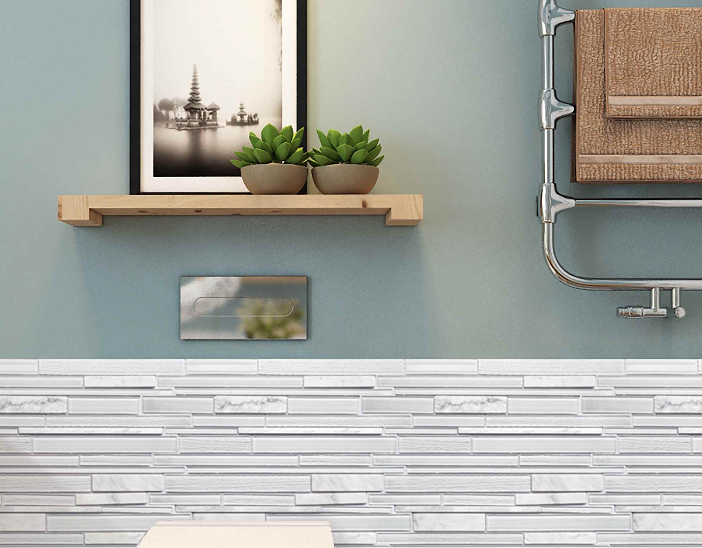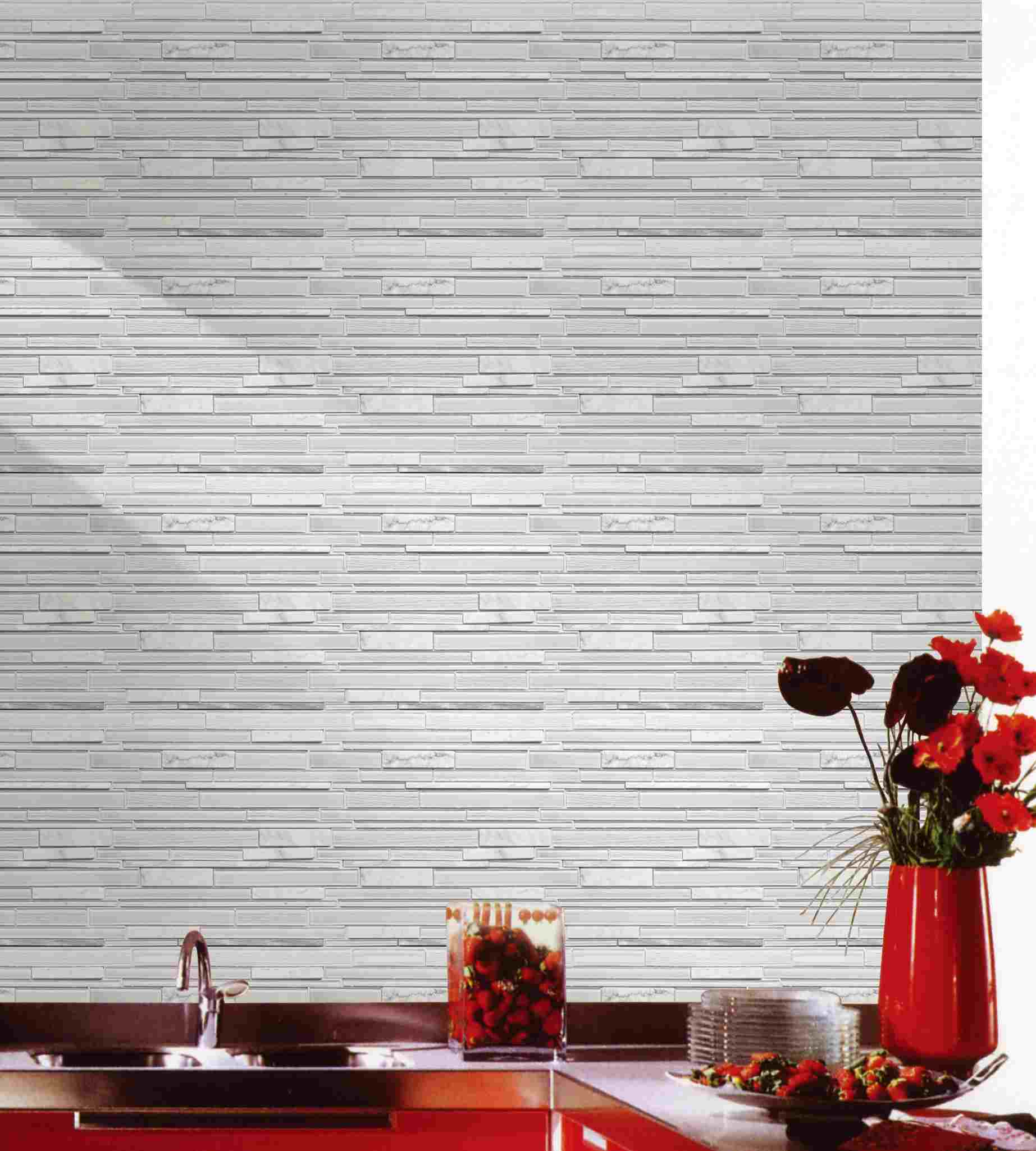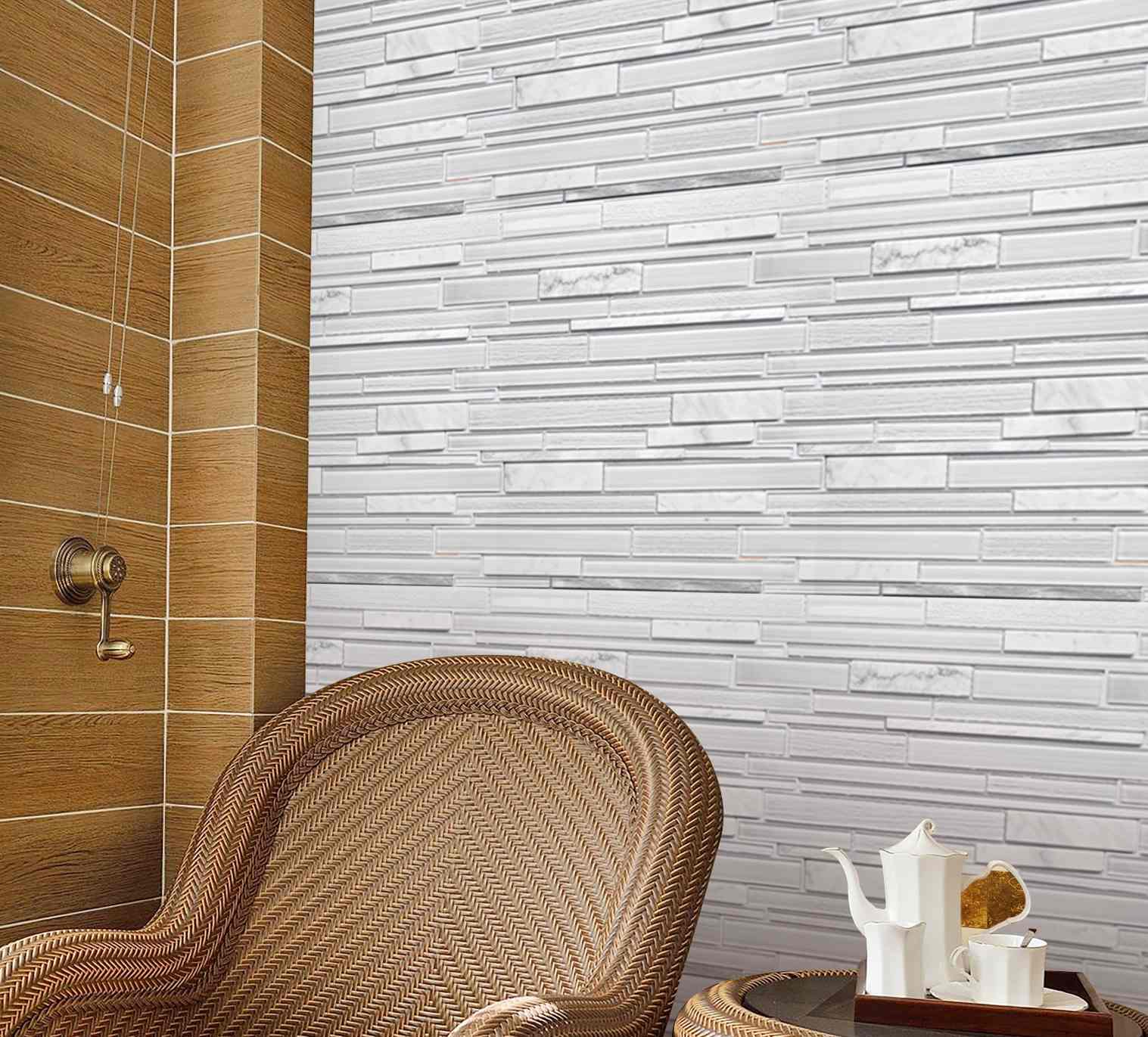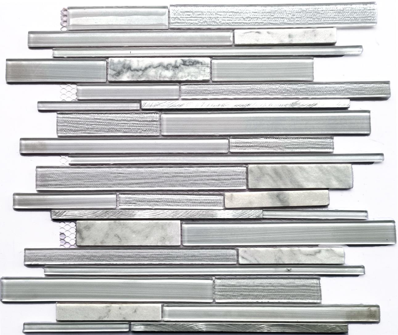 Este atractivo mosaico presenta una disposición aparentemente aleatoria de vidrio cristalizado y metal cepillado. Con elegantes tonos blancos, este azulejo crea un patrón distintivo. Ideal para usar en paredes interiores y exteriores, el mosaico tiene infinitas aplicaciones para complementar una variedad de instalaciones.