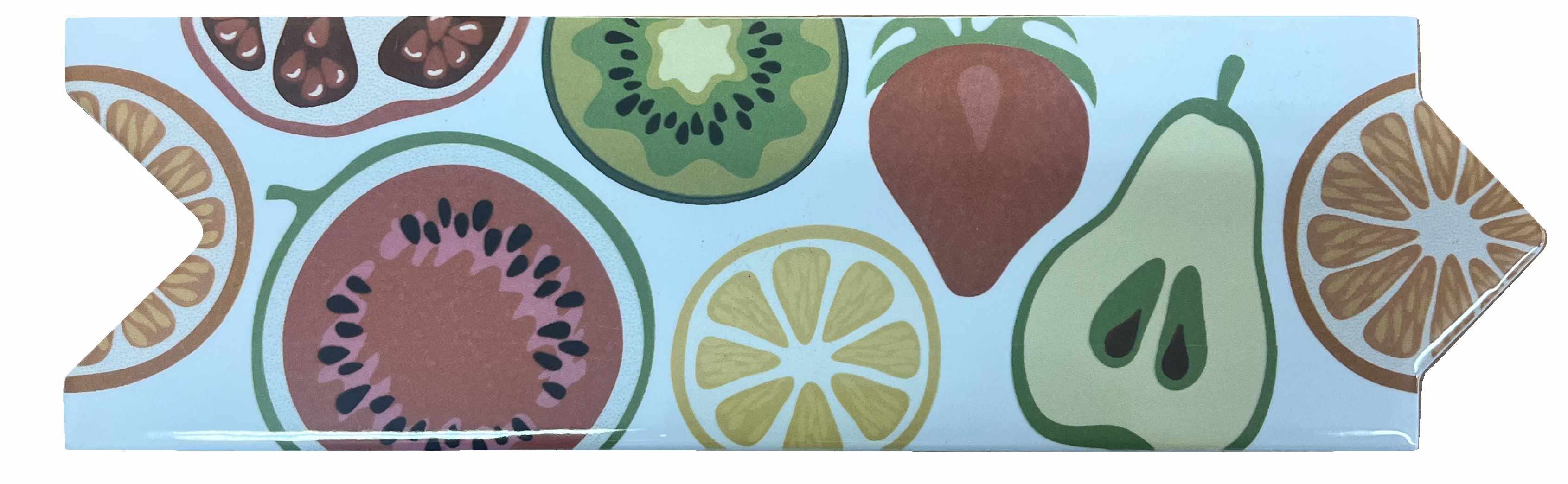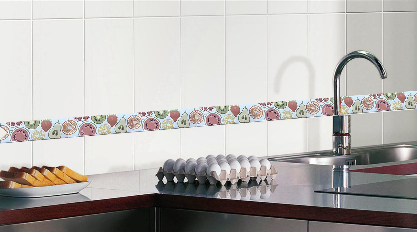 Cenefa decorativa con frutos coloridos como manzanas, limones y uvas. Esta gran cenefa frutal es ideal para la decoración de interiores como cocinas, comedores o incluso restaurantes que quieran tener un gran articulo decorativo en sus paredes.